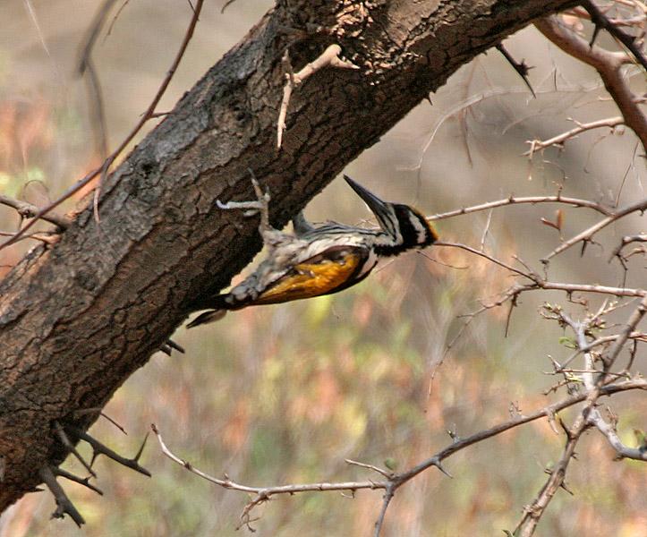 The white-naped woodpecker (Chrysocolaptes festivus) is a woodpecker which is a widespread but scarce breeder in the Indian Subcontinent. This flameback is a species associated with open forest and scrub with some trees. It nests in a tree hole, laying one or two white eggs. Like other woodpeckers, this species has a straight pointed bill, a stiff tail to provide support against tree trunks, and zygodactyl or “yoked" feet, with two toes pointing forward, and two backward. The long tongue can dart forward to capture insects. The white-naped woodpecker is a large species at 29 cm in length. It is a typical woodpecker shape. The white hind neck extends down the back, and the black shoulder patches also continue onto the back to form a V-shape bordering the white. The rest of the upperparts and wings are golden yellow. The rump and tail are black, and the underparts are white with dark chevron markings. The head is whitish with a dark moustache stripe and a black eye patch that extends down the neck sides. The adult male white-naped woodpecker has a red crown and females have a yellow crown. Young birds are colored like the female, but duller.
