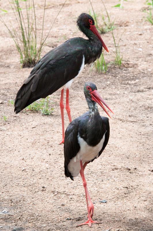 The black stork (Ciconia nigra) is a large bird in the stork family Ciconiidae. It was first described by Carl Linnaeus in the 10th edition of his Systema Naturae. Measuring on average 95 to 100 cm from beak tip to end of tail with a 145 to 155 cm wingspan, the adult black stork has mainly black plumage, with white underparts, long red legs and a long pointed red beak. A widespread, but uncommon, species, it breeds in scattered locations across Europe (predominantly in Spain, and central and eastern parts), and Asia to the Pacific Ocean. It is a long-distance migrant, with European populations wintering in tropical Sub-Saharan Africa, and Asian populations in the Indian subcontinent. When migrating between Europe and Africa, it avoids crossing the Mediterranean Sea and detours via the Levant in the east or the Strait of Gibraltar in the west. An isolated, non-migratory, population occurs in Southern Africa. Unlike the closely related white stork, the black stork is a shy and wary species. It is seen singly or in pairs, usually in marshy areas, rivers or inland waters. It feeds on amphibians, small fish and insects, generally wading slowly in shallow water stalking its prey. Breeding pairs usually build nests in large forest trees—most commonly deciduous but also coniferous—which can be seen from long distances, as well as on large boulders, or under overhanging ledges in mountainous areas. The female lays two to five greyish-white eggs, which become soiled over time in the nest. Incubation takes 32 to 38 days, with both sexes sharing duties, and fledging takes 60 to 71 days. The black stork is considered to be a species of least concern by the International Union for Conservation of Nature, but its actual status is uncertain. Despite its large range, it is nowhere abundant, and it appears to be declining in parts of its range, such as in India, China and parts of Western Europe, though increasing in others such as the Iberian Peninsula. Various conservation measures have been taken for the black stork, like the Conservation Action Plan for African black storks by Wetlands International. It is also covered under the African-Eurasian Waterbird Agreement and the Convention on International Trade in Endangered Species of Wild Fauna and Flora.
