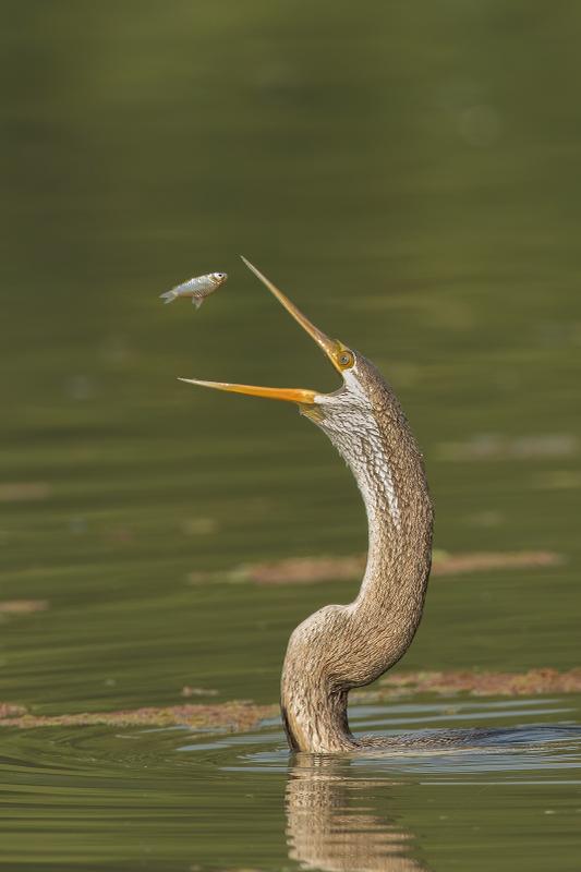 The Oriental darter or Indian darter (Anhinga melanogaster) is a water bird of tropical South Asia and Southeast Asia. It has a long and slender neck with a straight, pointed bill and, like the cormorant, it hunts for fish while its body is submerged in water. It spears a fish underwater, bringing it above the surface, tossing and juggling it before swallowing the fish head first. The body remains submerged as it swims, and the slender neck alone is visible above the water, which accounts for the colloquial name of snakebird. Like the cormorants, it has wettable feathers and it is often found perched on a rock or branch with its wings held open to dry.